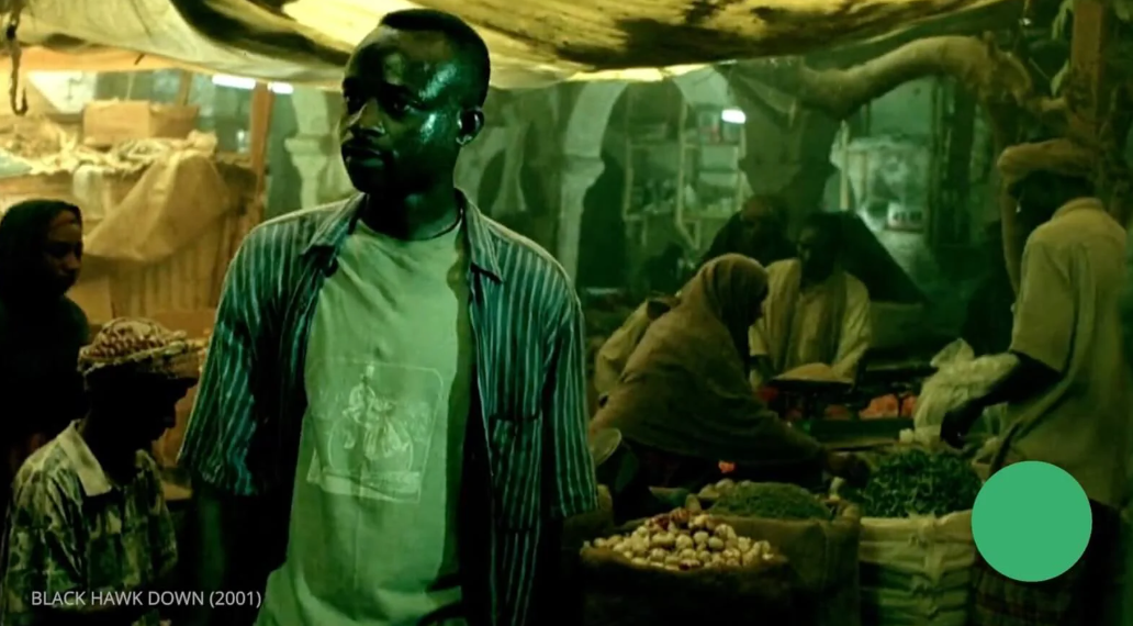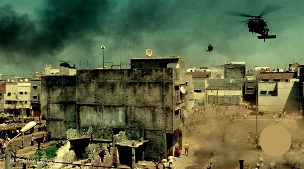 在《黑鹰坠落》中,斯科特运用了浑浊的棕色和橄榄色调来展现饱受战争蹂躏的摩加迪沙荒凉凄凉的景象。